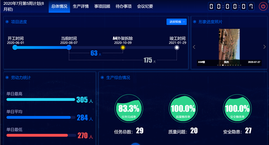 通过现场各岗位的智慧化应用,将完成工程实体时的质量、安全、工期、成本管理过程由经验转换为数字。数据分析决策平台(如图12)将各项数据直观的呈现给项目管理者。用数据支撑的新模式来代替靠经验估算的传统管理模式。