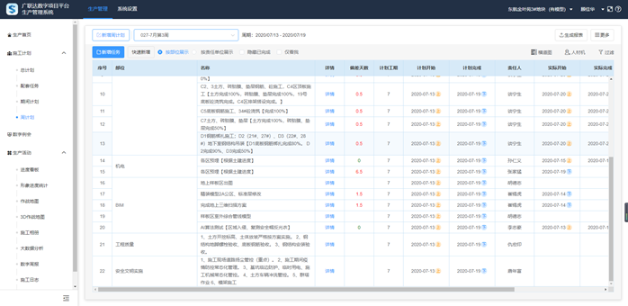 生产管理系统对项目每周计划进行详细管控,监理例会上各部门使用数字例会一目了然查看进度关键数据;同时可以追溯查看详细数据,对项目进行动态控制和调整,使项目进度更加可控;及时暴露进度问题,包括各分包任务完成率、滞后原因分析等,发现问题便于及时采取应对措施,保证工程项目如期交付;并对进度数据进行对比分析和监控报警等处理。