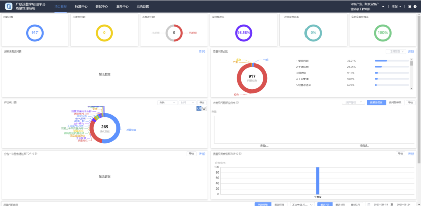 目前质量模块累计日常检查917条,整改率98.58%,质量评优213条,质量相册、施工图纸等模块有序推进。