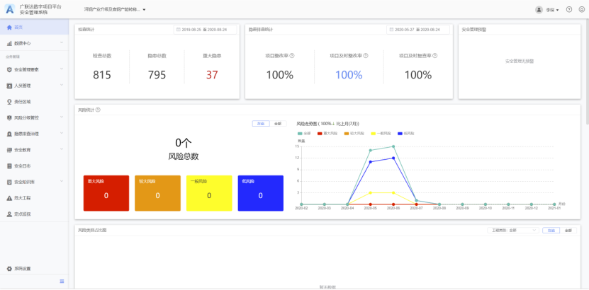 目前安全模块累计日常检查815条,整改率100%,安全评优140条,入场安全教育、安全日志有序录入。