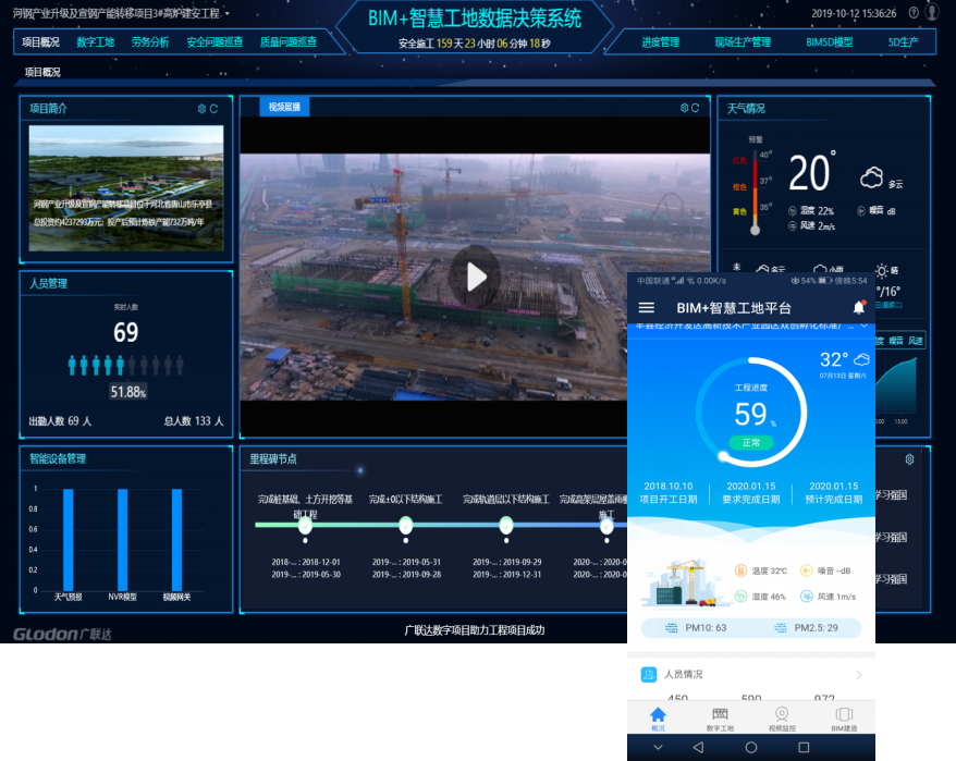通过智慧工地平台将施工现场的应用和硬件设备无缝衔接,并集成到统一的平台;将产生的数据汇集,形成数据中心;实现施工现场数字化、在线化、智能化的综合管理。目前智慧工地平台中人员管理、进度管理、质量管理、安全管理、视频监控管理等模块均正常运行。