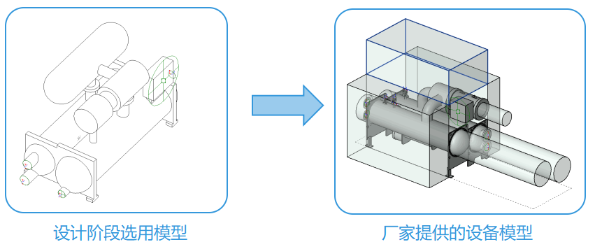 能源站的设计特性需要各设备厂家提供详细的BIM模型,仅通过协同模型的图源替换可完成部分专业的自动设计修改。