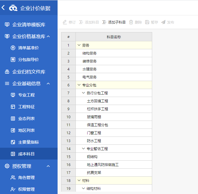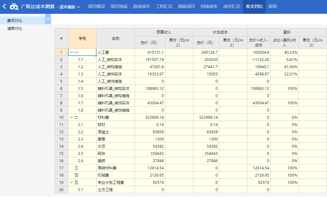 根据成本科目自动提取预算收入和支出成本进行盈亏分析;支出逐条清单对比成本价与预算价,分析盈亏情况。将企业分包数据在线存储,成本测算流程标准化、规范化,让企业内部即使是新人也能掌握成本测算的基础能力并且减轻后续审核工作量;措施和间接费用模板的储存和复用在提了产品需求后,现已上线,实现需求。