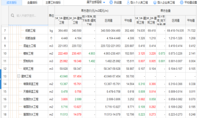 利用指标对比获取各期工程整个项目的主要工料消耗量和工料单价,在回到分析表格中计算分析各期工程整个项目主要工料单方造价。