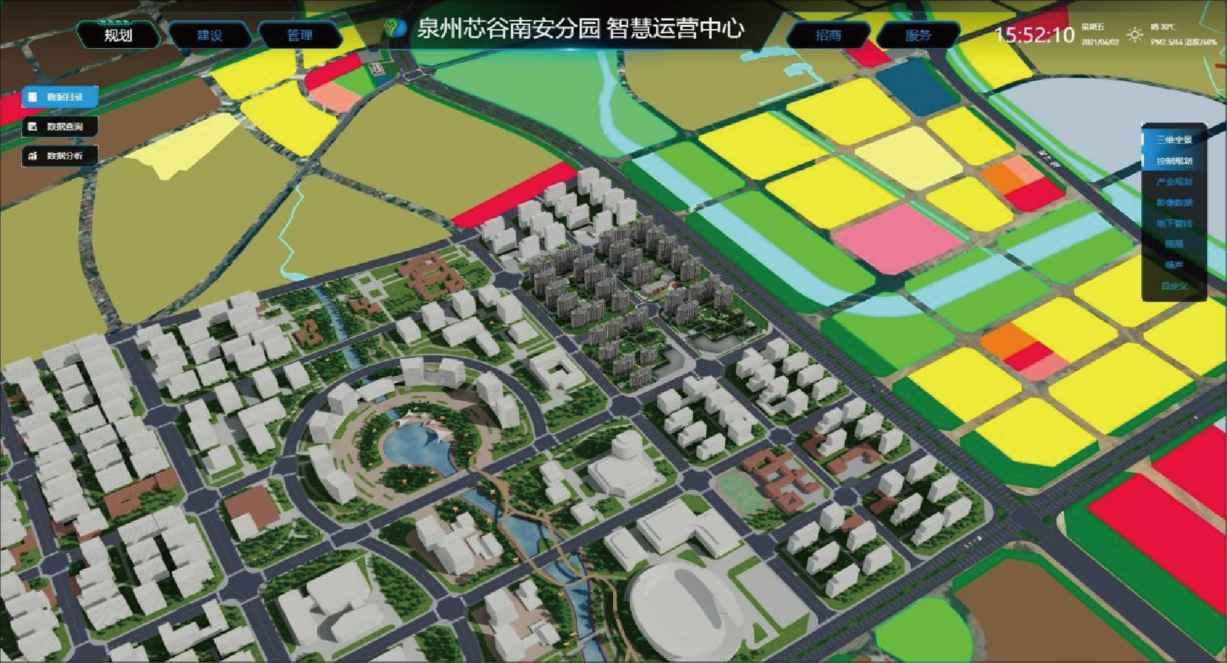 “2个中心”:数据中心与运营指挥中心。以BIM+3DGIS技术为依托,形成园区全方位、全时空的三维信息模型的数据中心。提供园区体征监测、综合管理、集中展示、智慧调度、数据分析、决策支持等服务的园区运营指挥中心。