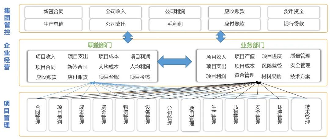 通过GEPS项目管理系统的三级管控,可以轻松搞定普遍存在的不同层级的业务管理痛点和难点。不仅能够打通集团、公司、项目的数据链,让公司可以实时查询生产项目经营数据,项目也可在线查看参考公司提供的资源。