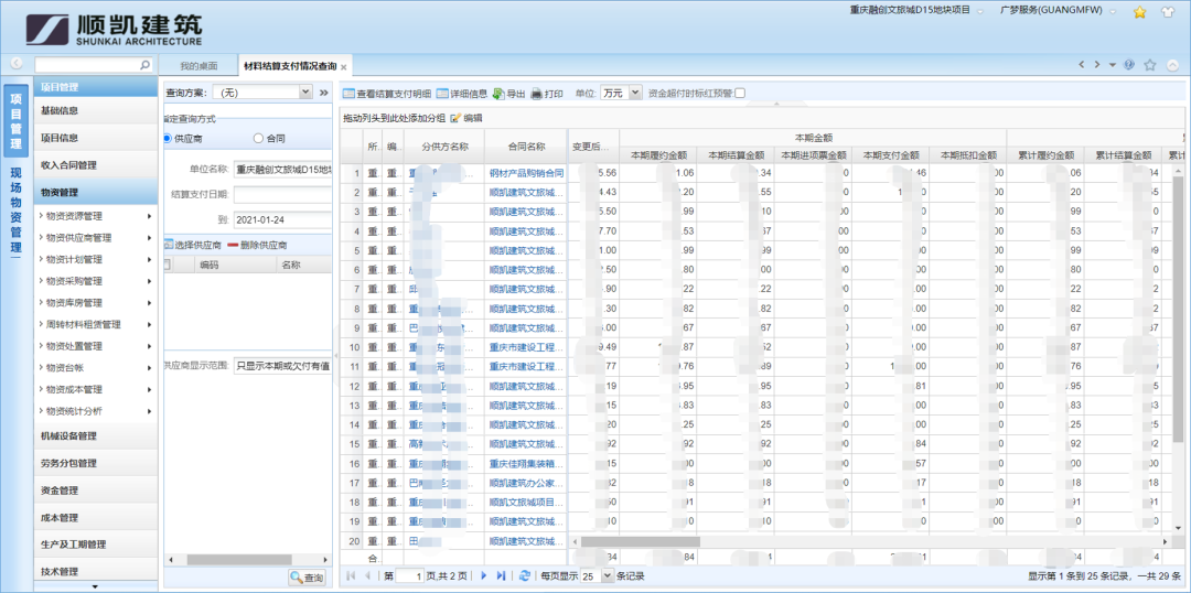 在项目管理系统中,各种统计数据多维度、多层级“瞬时”生成,大大提高工作效率。根据前期调研各业务部门的需求,开云官方调整出一套适合重庆顺凯建筑的业务单据打印格式,逐步替代手工填写报账,业务流程走向规范性。