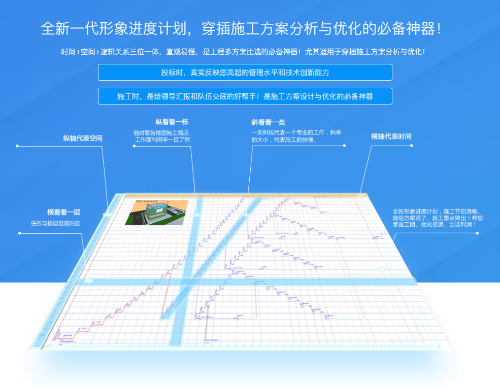 全新一代形象进度计划,穿插施工方案分析与优化的必备神器!全新一代形象进度计划,时间+空间+逻辑关系三位一体,直观易懂,是工程多方案比选的必备神器!尤其适用于穿插施工方案分析与优化! 投标时 真实反映您高超的管理水平和技术创新能力! 施工时 是做施工方案分析、给领导汇报和队伍交底的好帮手!让计划沟通和计划管理更简单、高效! |