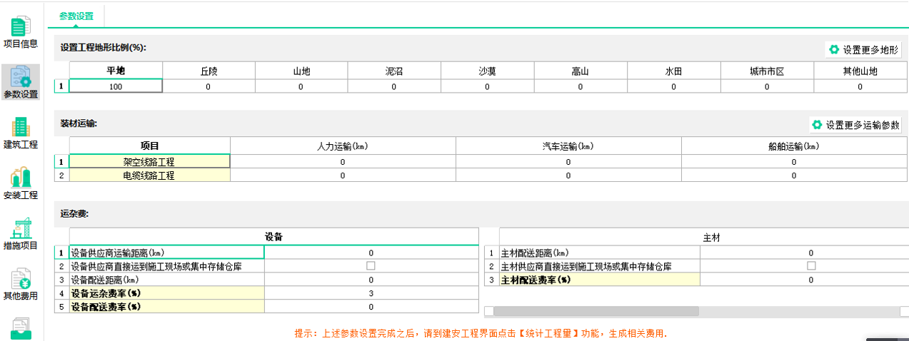 可以对电力的特殊费用(地形增加费、装材运输、运杂费)进行统一设置,后续执行【统计工程量】功能对于费用统一计取。