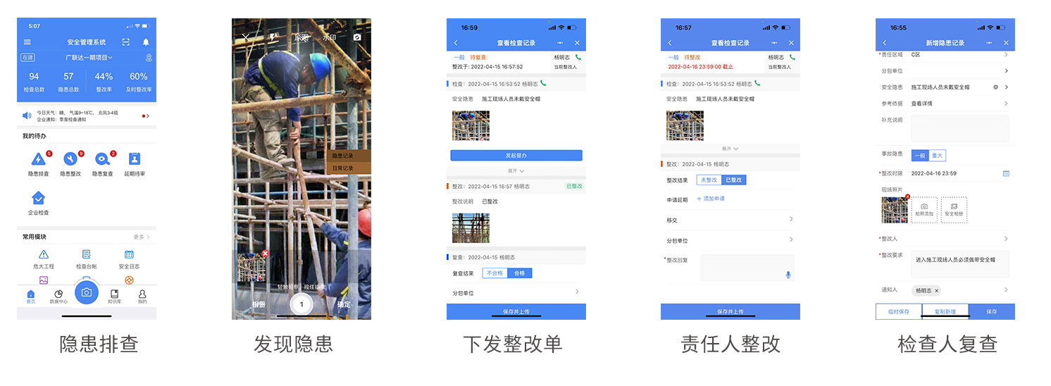 核心场景二:隐患排查治理企业: 1. 内置12000+条安全隐患库 2. 排查-整改-复查标准闭环流程 3. 重大隐患自上而下督办 项目: 1. 全流程实时流转至责任人 2. 记录留存、管理有痕 3. 自动生成各种单据、台账 4. 隐患自动关联规范要求 |
