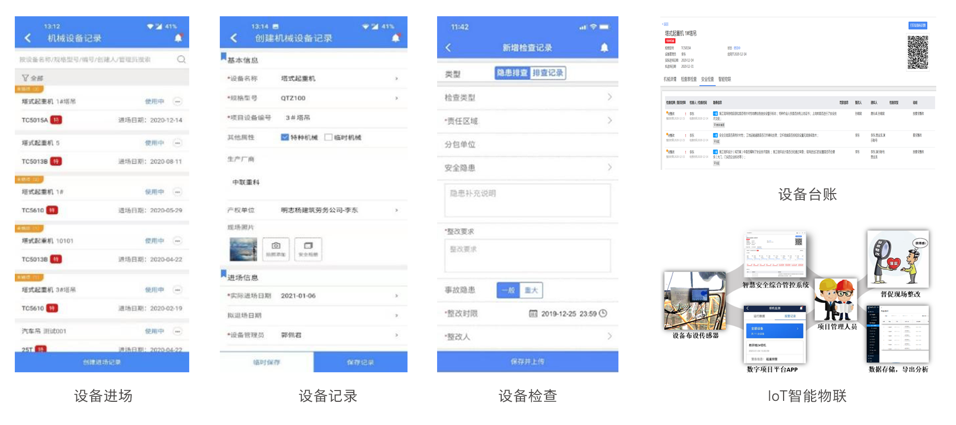 核心场景五:机械设备管理企业: 通过分析,实时了解企业大型机械设备的分布情况、安全状况,提前发现问题、解决问题,最大限度减小对企业的损失 项目: 1. 提升设备进出场登记、过程检查管理效率 2. 实时掌握、分析设备运行情况 3. 及时预警安全风险,提高使用工效 |