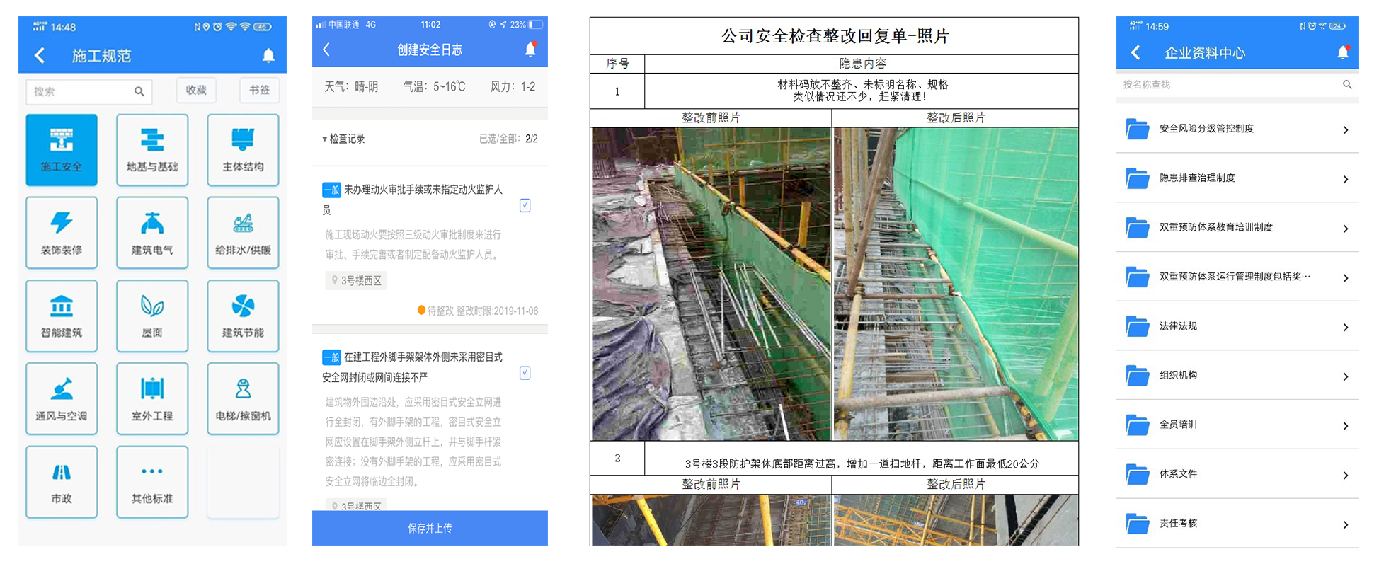 核心场景六:安全资料管理移动知识库:提供590本规范,涵盖国标+行标+地标施工相关所有规范,随时随地上APP查看 智能资料仓:安全日志等各类表单报表自动生成,一键打印,方便快捷,电脑端可打印存档 档案小能手:内部影像等资料自动分类归集,可多维度筛选,便于素材查找 |