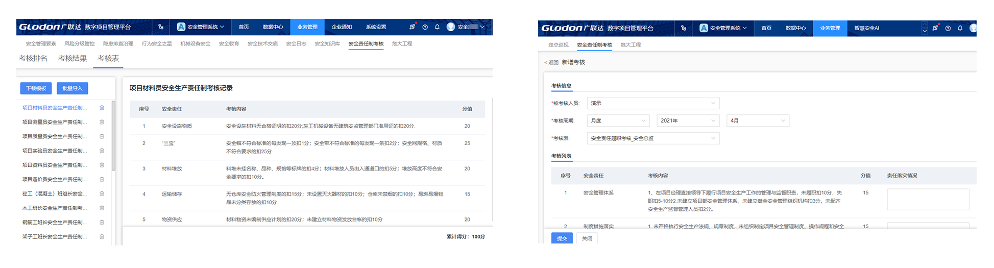 核心场景七:履职考核管理企业: 1. 自动生成企业安监部门人员的履职统计,支撑对企业安全管理人员的履职能力进行评价及考核 2. 实现企业对下级单位安全管理人员责任制考核、履职评价,统一标准、管理直观、考核透明、自动排名 项目: 自动生成项目安全员、责任工长等人员的履职统计,支撑企业对项目人员履职能力的评价及考核 |