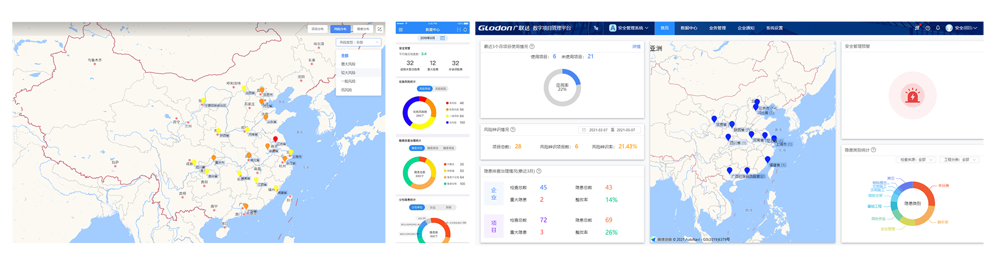 核心场景八:数据分析及预警企业: 1. 企业安全地图,快速定位项目、风险、隐患分布,主动预警,防患未然 2. 多维度数据分析支撑领导层决策制定 项目: 项目经理随时随地掌握项目安全状况,数据分析发现项目安全管理疏漏,及时补救 |