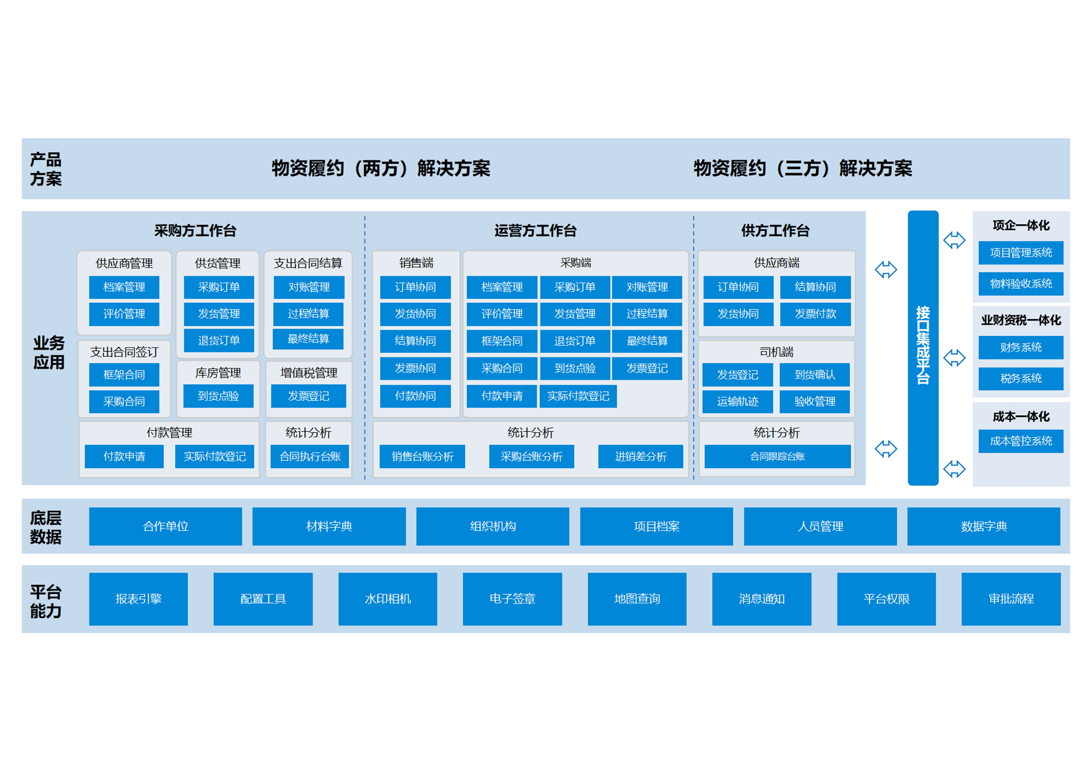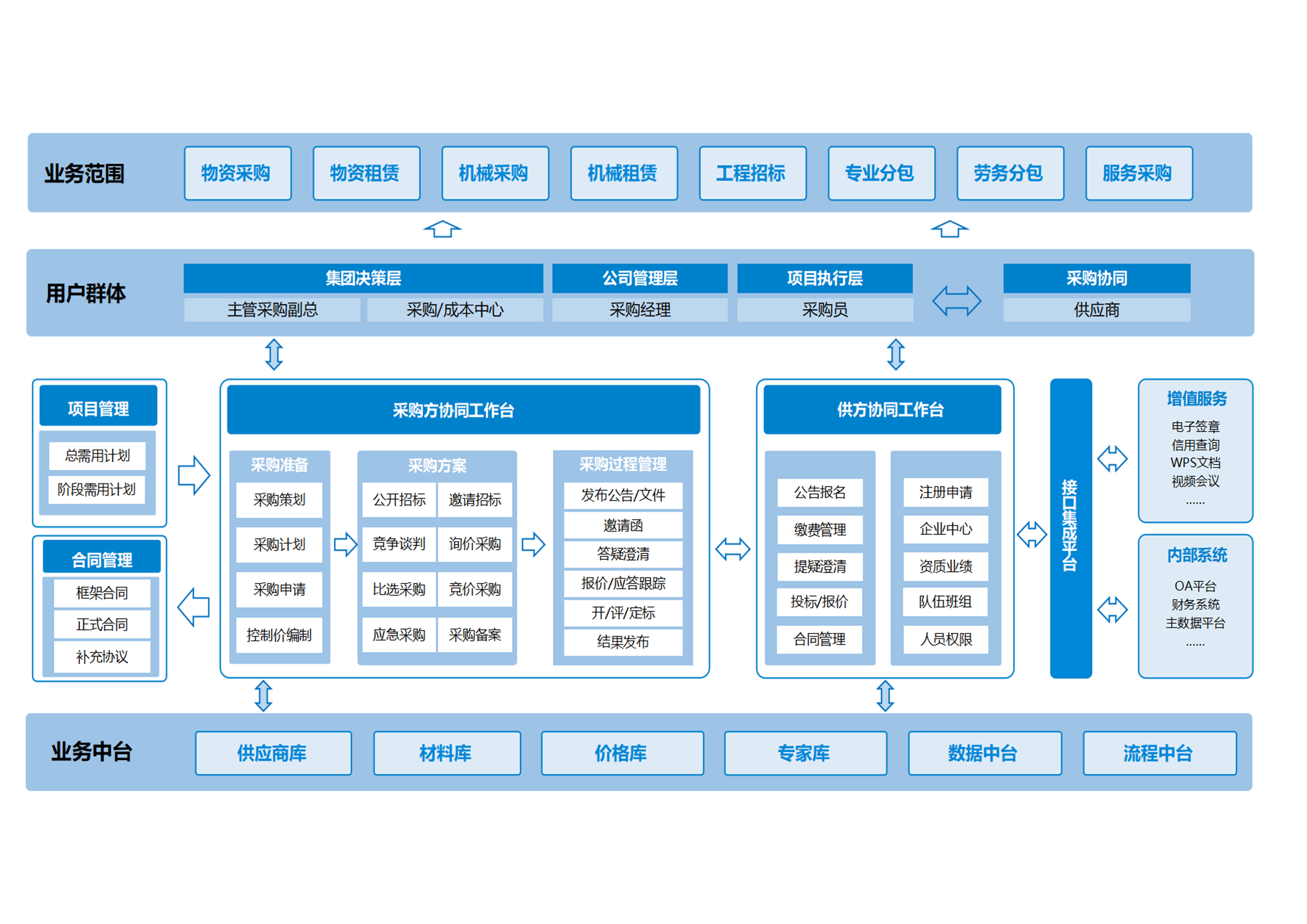 1. 整合上下游资源、连接内外部合作伙伴,实现全品类、全项目的一站式采购协同;