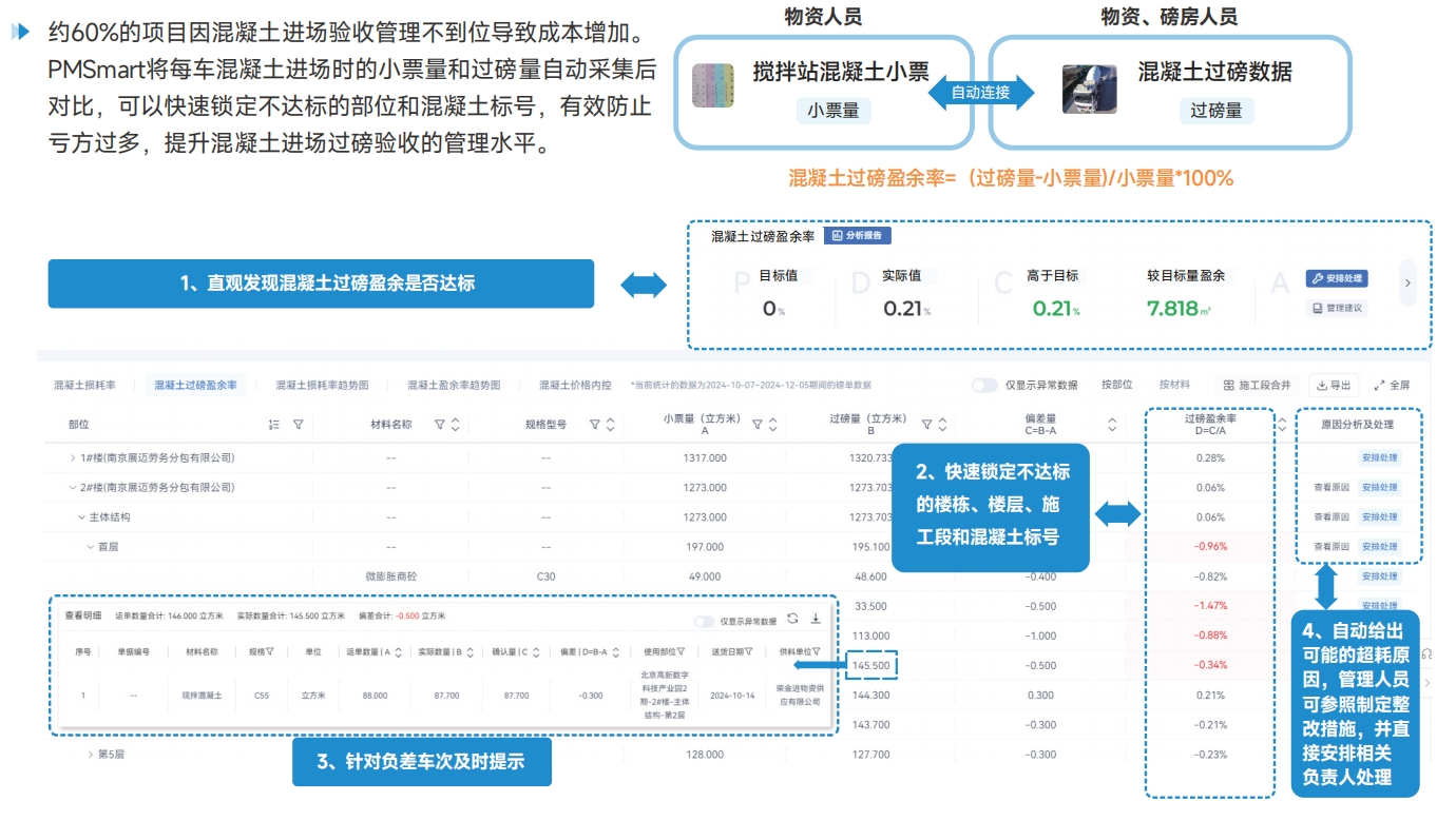 混凝土过磅盈余管理混凝土进场盈亏一目了然,避免亏方过多,降低混凝土成本损失1% 约60%的项目因混凝土进场验收管理不到位导致成本增加。PMSmart将每车混凝土进场时的小票量和过磅量自动采集后对比,可以快速锁定不达标的部位和混凝土标号,有效防止亏方过多,提升混凝土进场过磅验收的管理水平。 |