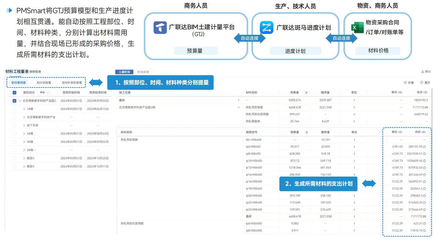 物资需用管理物资需用自动计算,使提量准确度提升50%,效率提升80% PMSmart将GTJ预算模型与生产进度计划相互贯通,能自动提取不同层级部位的钢筋、混凝土、砌块及装配式构件等材料需用量,并实现三维模型和AI智能提量,还可以结合生产进度计划实现按周、按月一键提取需用量,并结合现场已形成的采购价格生成所需材料的支出计划。 |