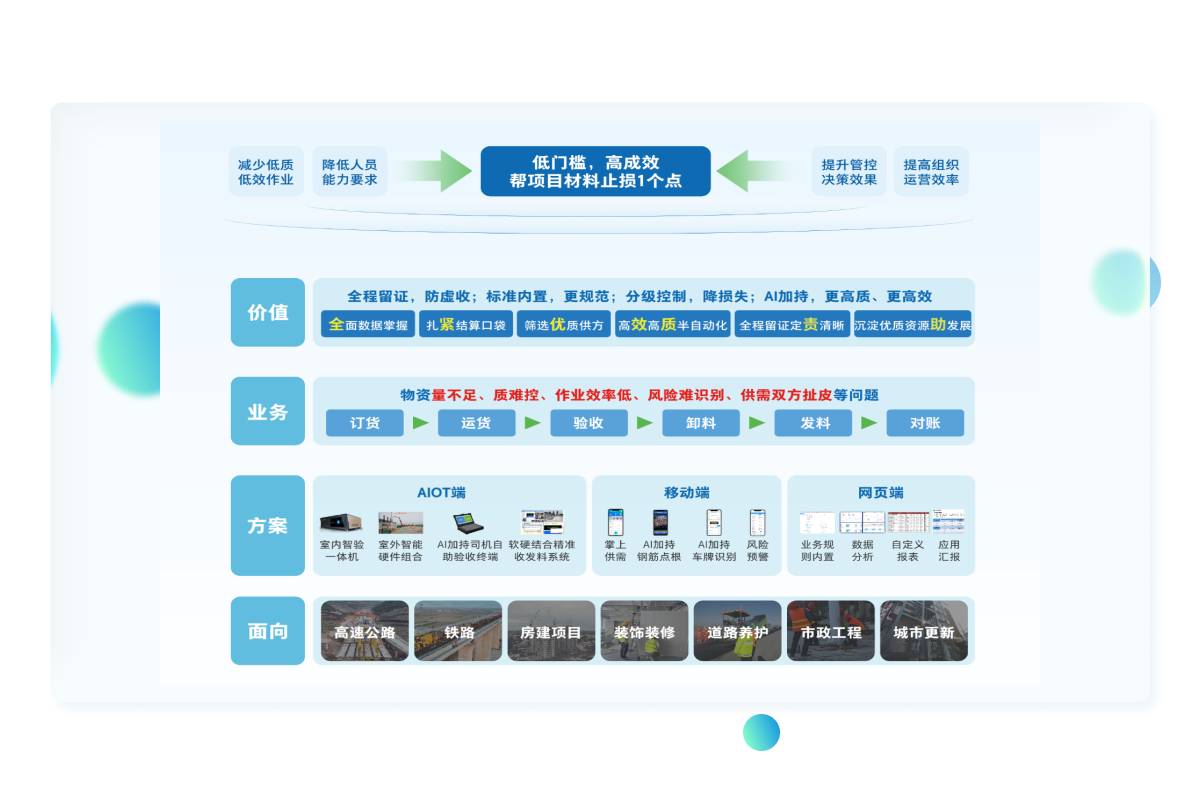 价值主张面向工程施工项目,围绕材料现场关键环节,提供AI+IOT软硬一体的物资精细化管控方案。实现: 数量真实:AIOT+影像全程控制留证,防虚收 质量规范:多专业质量标准深度内置,更规范 风险可控:规则+数据自动触发分级控制,降损失 作业自动化:AI+数据替代低质低效手工,更高效 低门槛、高成效,助力项目材料止损1个点! |