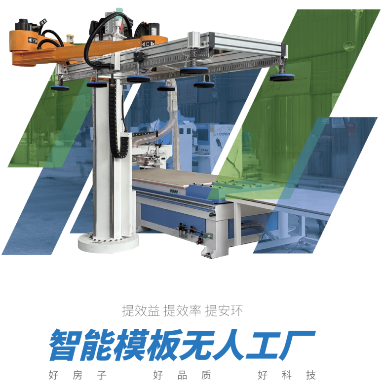 采用智能机器人与数控设备相互配合,全面替代人工。基于管理控制单元下发的加工指令,一天10个小时可加工模板800-1000平米。对于异形模板,效率更可提升几十倍,加工误差在0.5mm以内,大大减少质量问题。