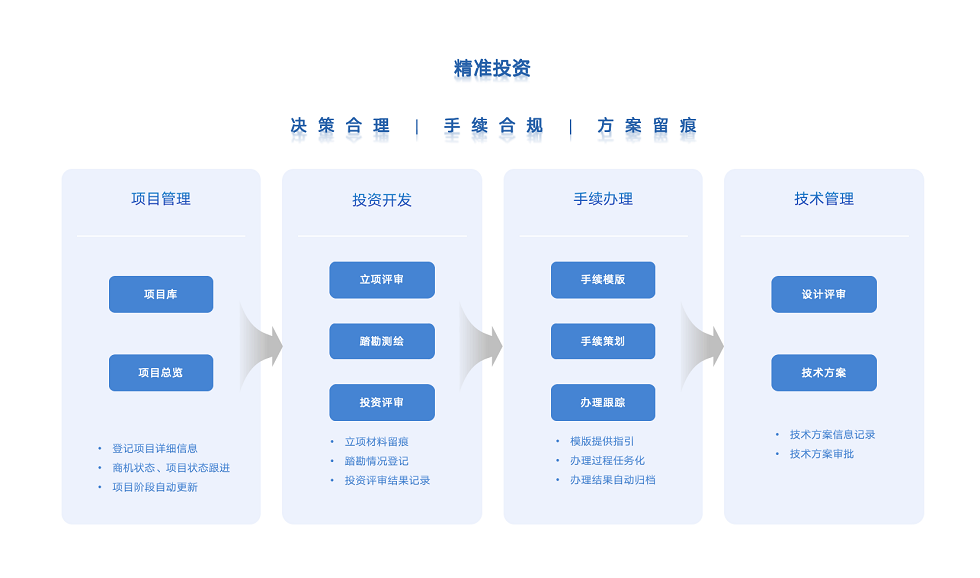 以 “决策合理、手续合规、方案留痕” 为目标,含四大环节:项目管理靠项目库与总览,实现信息登记;投资开发对项目立项、踏勘、评审留痕;手续办理借模板提效;技术管理负责方案审批,保障投资精准。