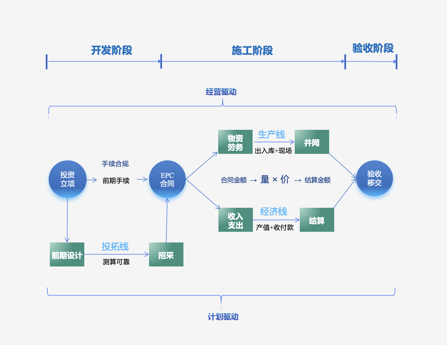 以 “定收入、控成本、管支出” 为目标,含三维度管理。定收入以 EPC 合同价为目标,签约到结算汇总产值与发票;控成本以预算为基线考核收支;管支出以合同价付款,覆盖物资等,全流程管控。