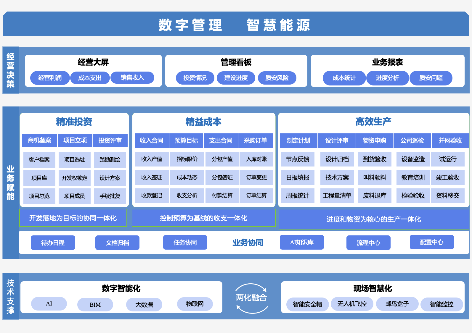 ·技术支撑:依靠数字智能化与现场智慧化,通过两化融合,全方位赋能新能源项目管理与运营