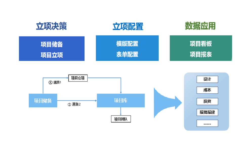 针对项目,构建标准化立项管理模块,支撑项目储备与立项,涵盖模板配置、表单配置,还有项目看板、报表的数据应用,助力项目后续设计、成本、投资、报批报建等工作开展。