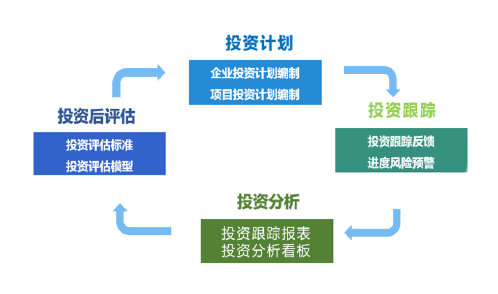 针对固投项目,构建轻量化投资管理模块,支撑投资计划编制,计划跟踪反馈,进度风险预警及投资后评估模块。