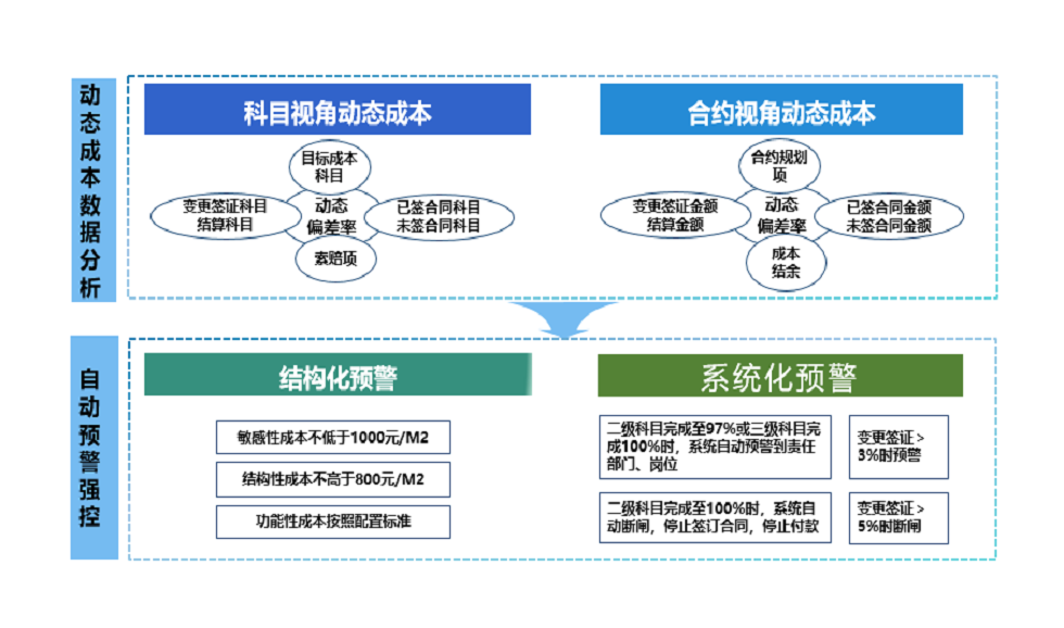 从科目或合约视角整合全阶段成本,判断成本走势以辅助决策;同时设置预警提醒并明确责任部门与岗位,对超支科目标注并附明细,确保高效处理。
