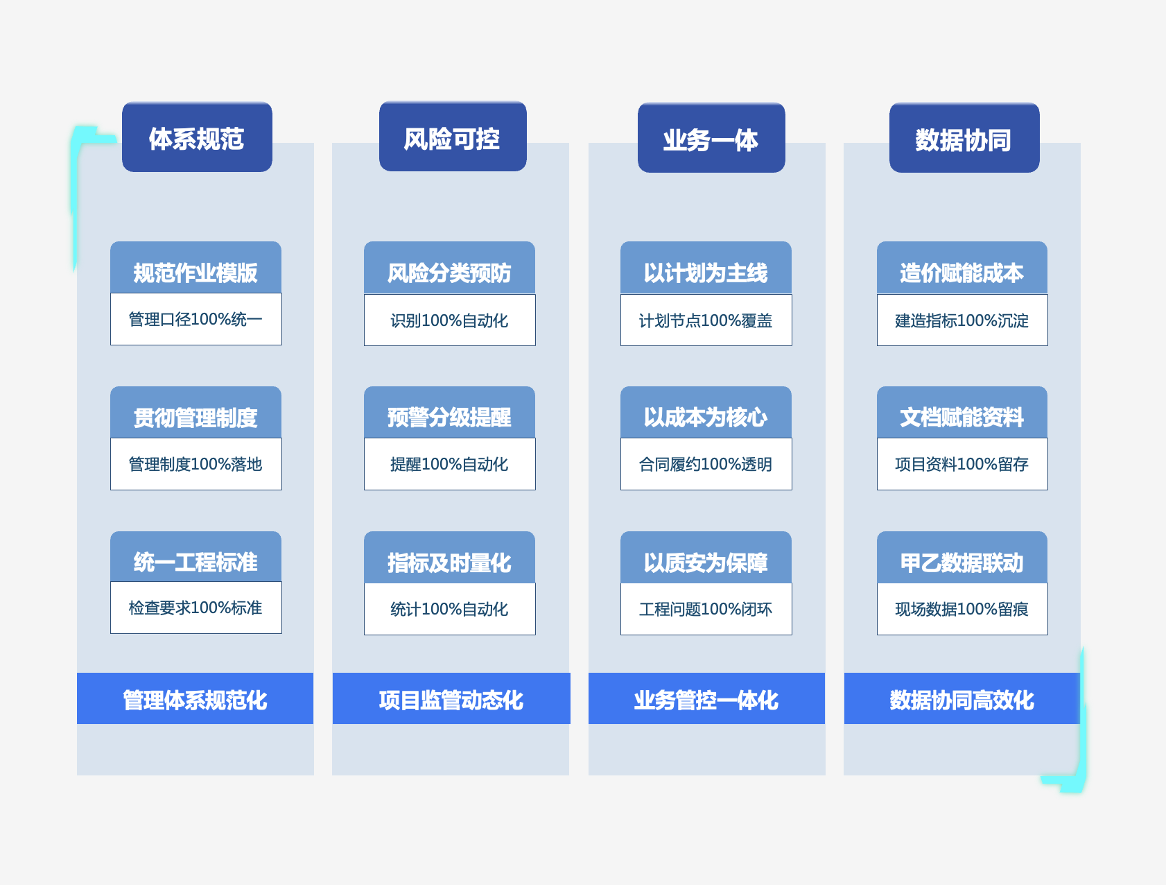 面向城投企业,围绕项目建设全过程管理,以 “体系规范、风险可控、业务一体、数据协同” 为理念,助力企业实现管理体系规范化、项目监管动态化、业务管控一体化、数据协同高效化。