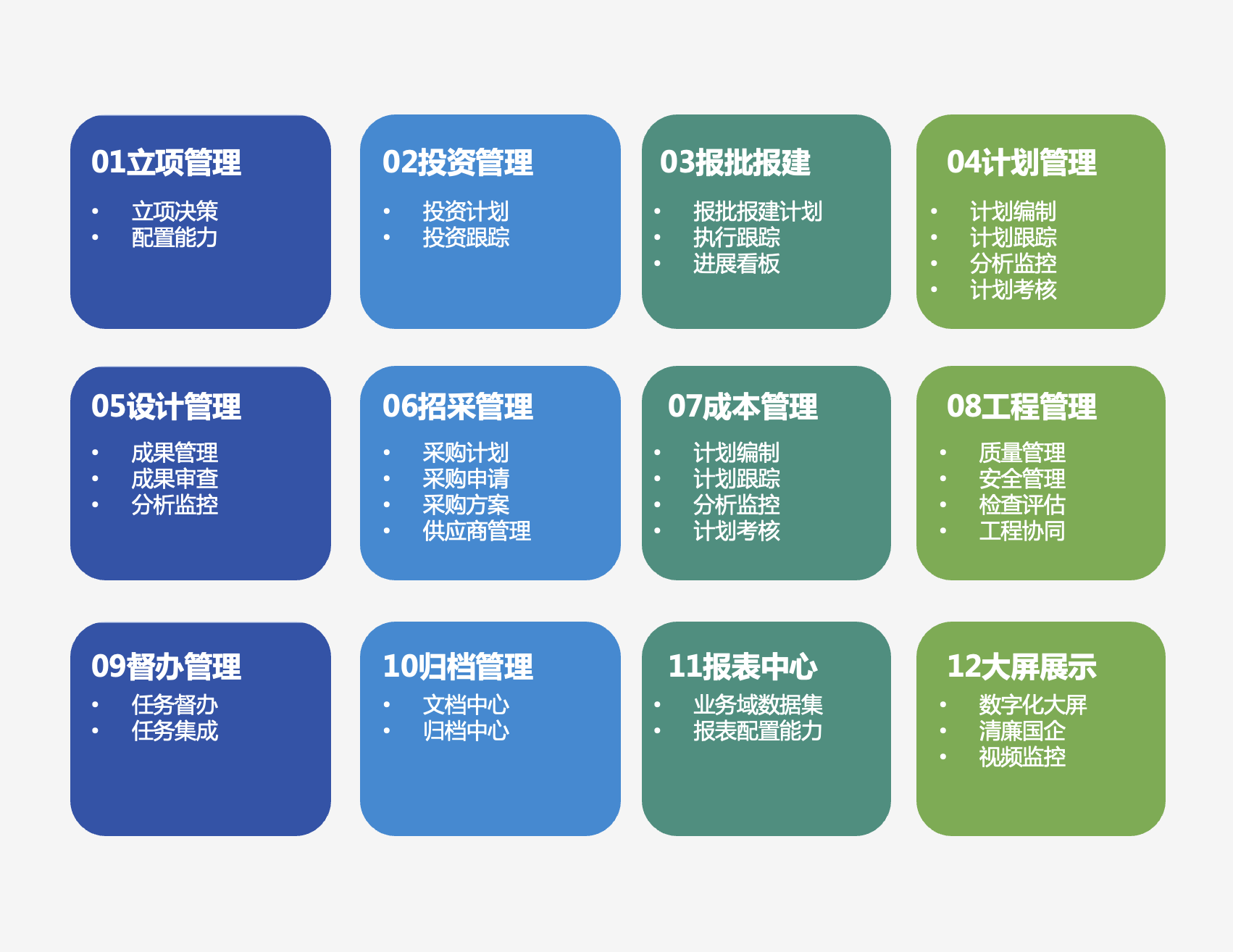 面向城投企业,围绕项目建设全过程管理,为企业提供 12 大业务域, 40 多个子业务场景,内容包含立项、投资、报批报建、计划、设计、招采、成本、工程、督办、归档管理,以及报表中心、大屏等,覆盖项目全流程各环节管理与数据呈现。