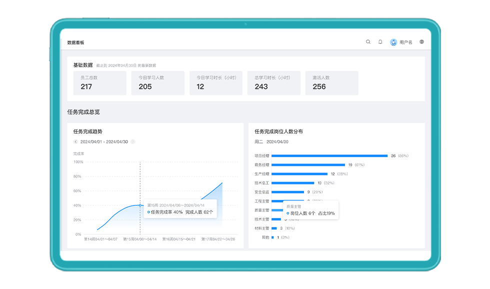 • 提供多维度的学习效果评估 • 为管理者制定员⼯学习发展策略提供数据⽀撑 • 让学习效果可视化、可量化、可追踪 • 帮助企业精准评估⼈才培养成效