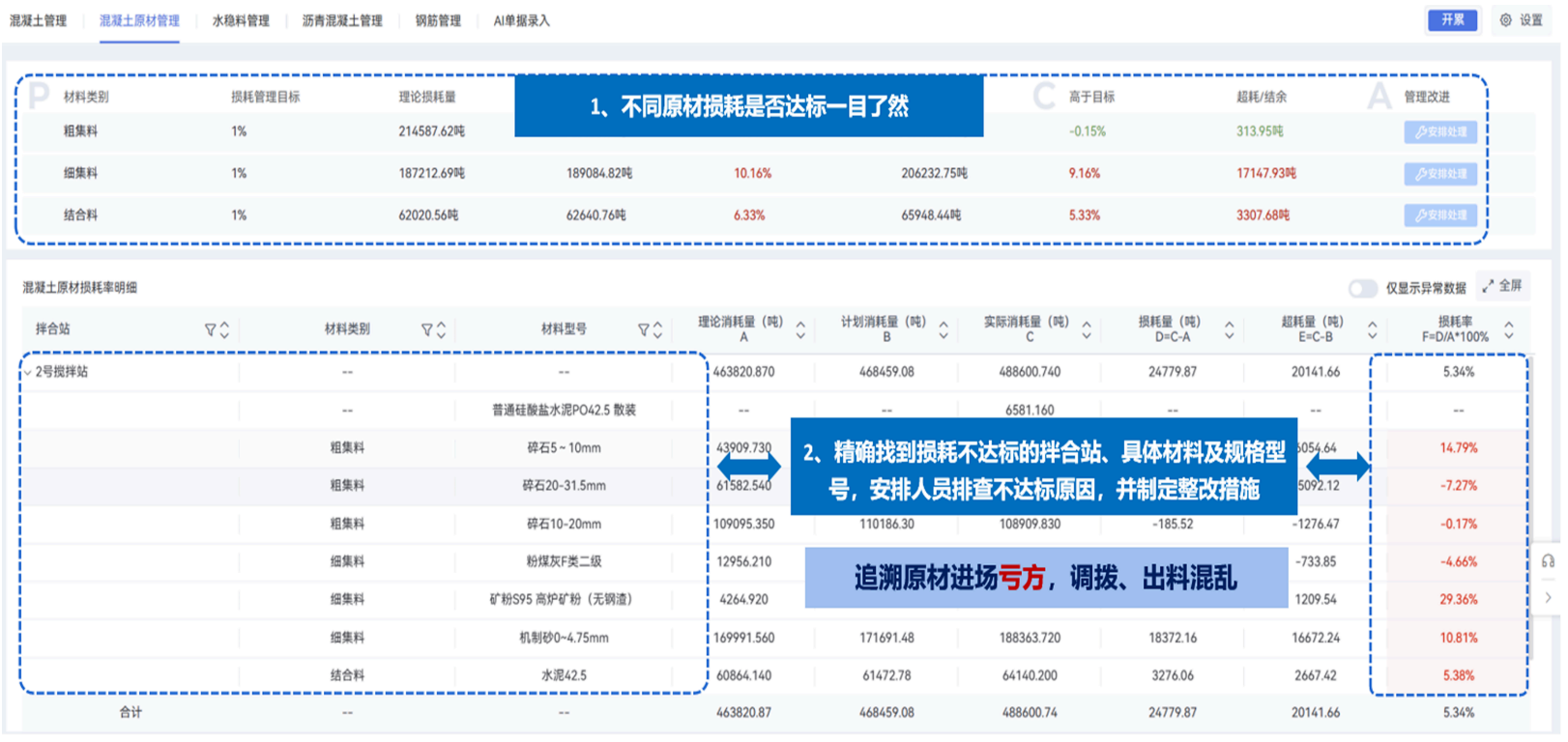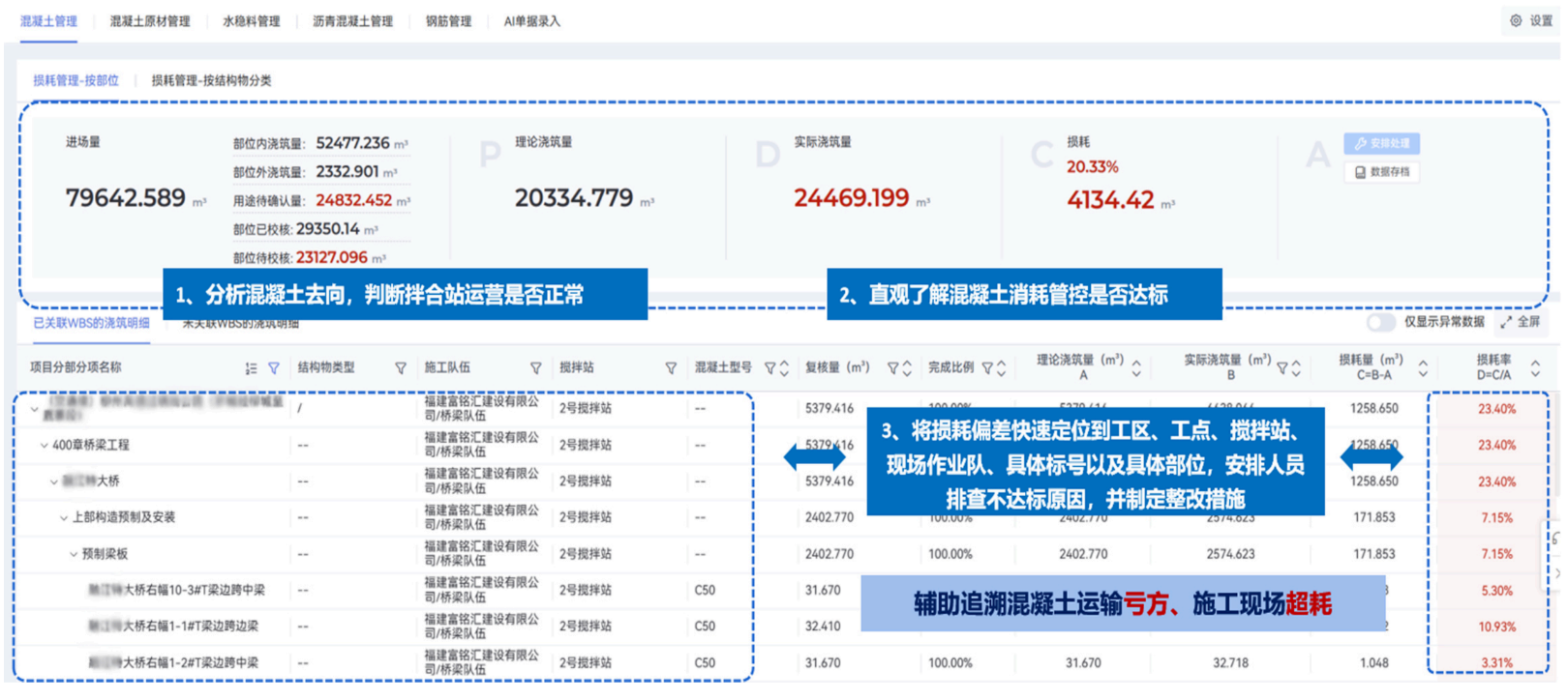 准确定位混凝土原材超耗的规格型号与责任主体,为管理改进与分包扣款提供数据支撑。使项目混凝土原材损耗率降低2%,实现混凝土原材损耗的精细化管控
