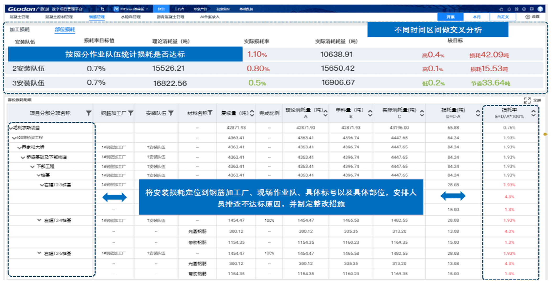 安装队伍的钢筋损耗率偏差,与责任主体,为现场改进与经营管理提供数据支撑,使项目钢筋损耗率降低1%-3%