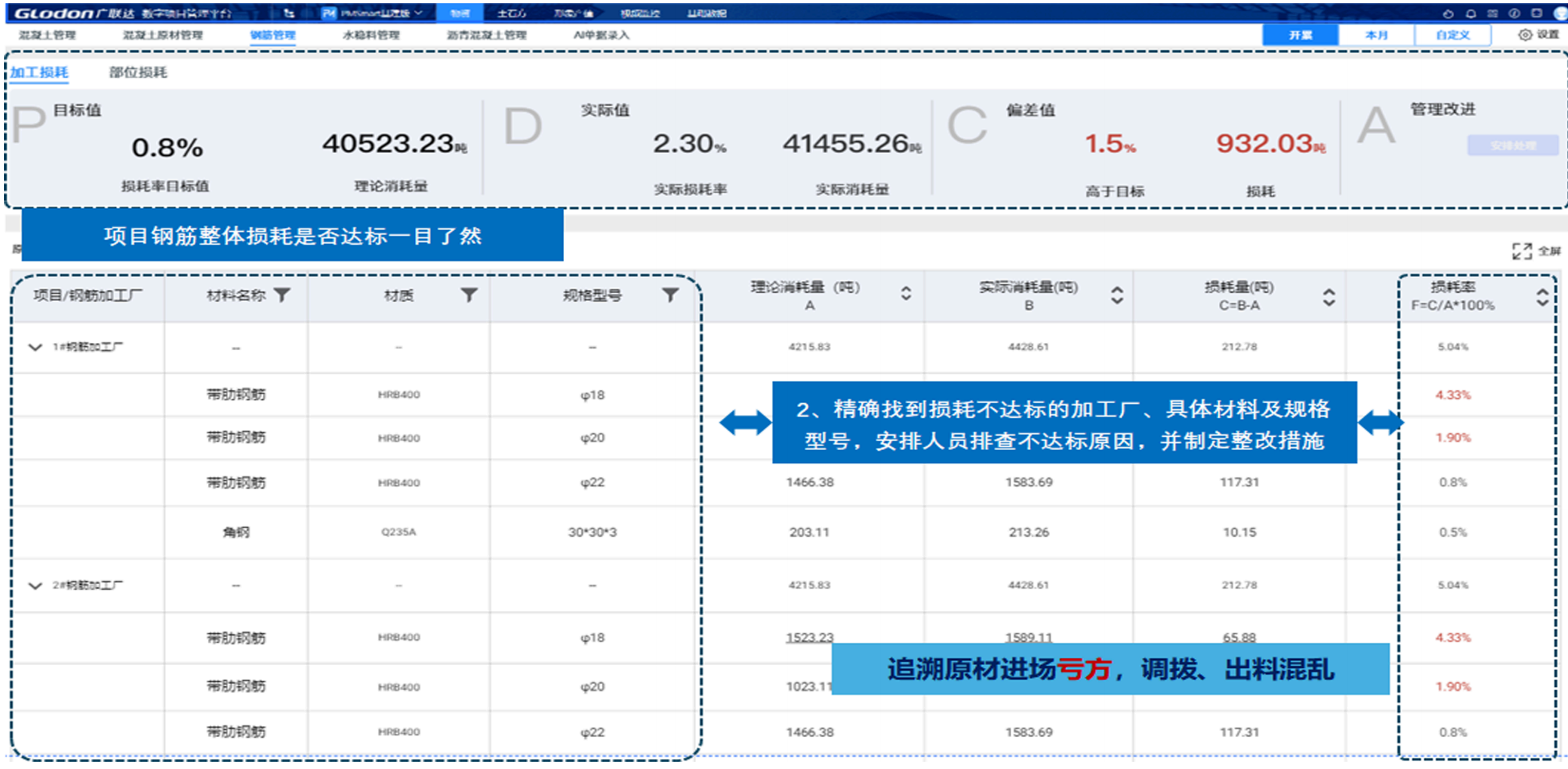 加工厂钢筋损耗率偏差,与责任主体,为现场改进与经营管理提供数据支撑,使项目钢筋损耗率降低1%-3%