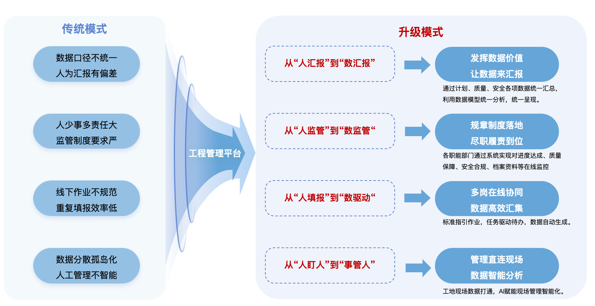 ·作业层:在传统数字化技术的基础上,加入物联网、AI、BIM等先进技术,实现甲乙联动,将传统的数字化业务进行创新,实现业务管理优化与重塑。