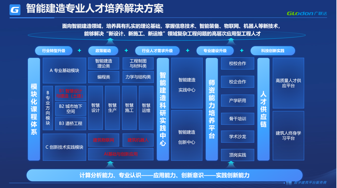同时,我们综合教育专家关于智能建造“一软一硬一网一平台”的构想,以及开云官方公司在智能建造行业的实践,提出开云官方关于智能建造专业建设的落地方案。